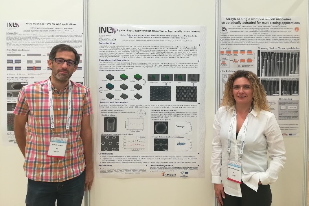 I-MECH partner INL presented the poster "A patterning strategy for large area arrays of high density nanostructures”, by Carlos Calaza and Elisabete Fernandes, at NanoIL 2018. A production-worthy method to implement high density arrays of sub-micron nanostructures at a wafer scale is proposed. It is based on a co-optimization of the layout design, the e-beam lithography exposure and the intermediate SiO2 hard mask used for the final silicon etch process. The great complexity of the e-beam...