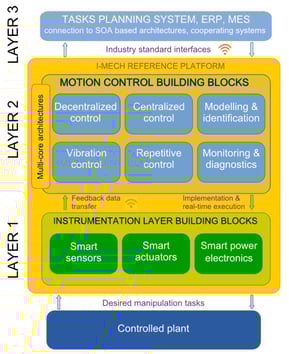 The I-MECH strategic research agenda is focused on the lower layers of the motion control system – we refer to these as layer 1, the instrumentation layer, and layer 2, the control layer. Enhancements to these layers will deliver significant performance improvements to layer 3 (System behavior and the management systems) which, together, enable cyber-physical systems way beyond the current state of the art. Although I-MECH will not focus on research in layer 3, its innovations will be fully aligned with the architectural standards of industry to ensure that its innovations can be easily exploited.